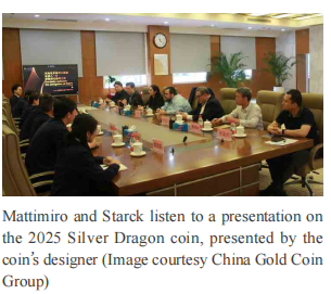 After the tour, the group sat down with the executive and design teams behind the Dragon coin. The coin’s designer shared a presentation on the artistic process and the various elements that make up the final image. Over 60 different pattern coins were created before the ultimate design was chosen.The following day, Mattimiro, Starck, and Chou headed to Beijing, where a packed schedule awaited for the rest of the trip.
