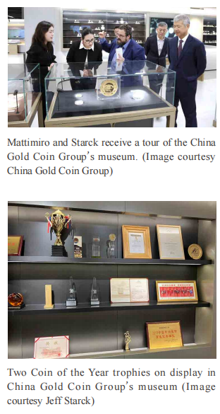 Meeting with members of China Gold Coin Group at their offices was first on the agenda. The office building also houses a museum that tells the story of China Gold Coin and the coins and medals it has produced. The group was excited to see a small display of awards the Mint has received, which included COTY trophies. After the tour, everyone sat down to discuss the coins that China Gold Coin produces and the COTY program.