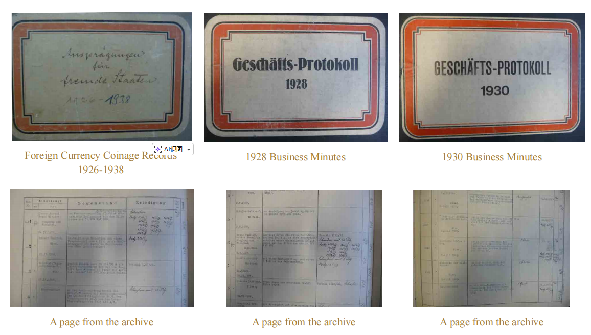 The discovered Vienna Mint archives consist of two kinds of records: printed business minutes and handwritten purchase, processing, and handling notes. The handwritten documents also contain records of the Republic of China buying minting equipment and commissioning work, but those are not excerpted here.