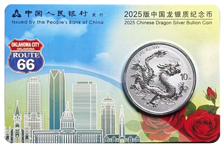 今年展會上一款備受矚目的獨家產品是2025中國龍年銀質投資幣俄克拉荷馬城特別版。該版本限量3,000枚,封裝於以66號公路為設計主題的專屬城市卡中,每人限購一枚。如果您成功入手,在此表示祝賀!