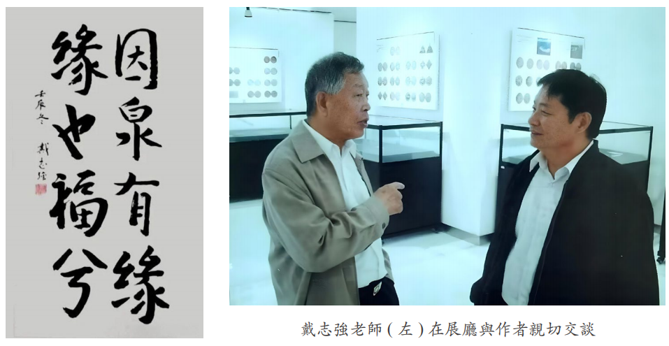我和戴老師“因泉有緣,緣也福兮”。2012年9月27日,“珍稀特外幣展”在大唐西市博物館隆重開展, 戴老師蒞臨祝賀,先天晚告訴我他已到西安。開幕式後,同仁朱有儀拍下了戴老師和我在展廳親切交談的寶貴瞬間。