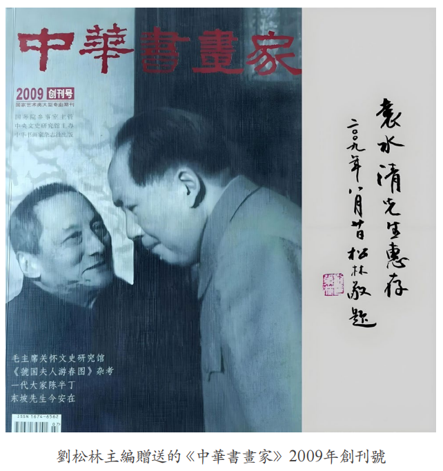 在中國當代書法界, 沈鵬、 歐陽中石等名列前茅,被譽為泰斗。 我曾為請誰題寫書名犯難,因那些大名人, 我只知其名,未曾謀面。《收 藏》編輯部一位同仁對我講,《中華書畫家》雜誌是以“ 弘 揚 經 典, 推 崇 大家”為宗旨的8開大型期刊,其主編劉松林是歐陽中石的弟子, 你認識劉先生,不妨托他請歐陽老師題簽。其實我和劉松林僅是一事之交, 並不認識。2009年9月《中華書畫家》創刊號出版後,劉松林從《收藏》雜誌編輯部瞭解到我喜歡書畫,朋友多。於是直接打電話給我, 並寄贈我一本《創刊號》, 請我代他推銷,每本80元。我爽快地答應了。之後不長時間把他快遞來的8本雜誌全部銷完。為此他很感激我,有了這層關係,我想求他幫我忙應該問題不大。