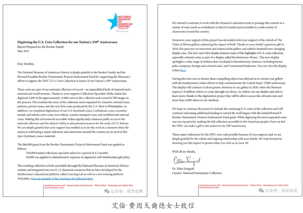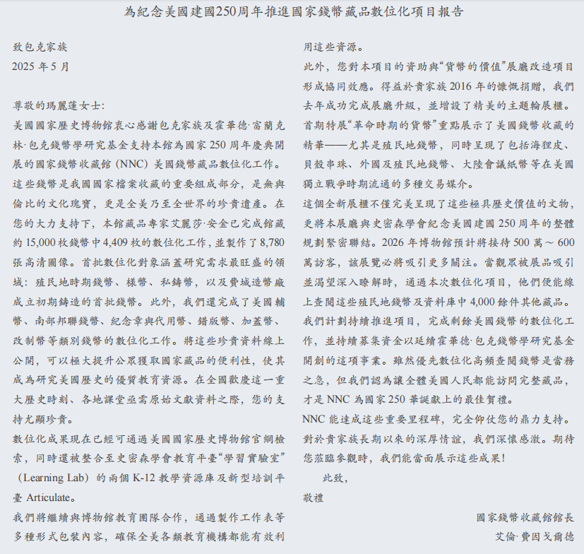 她在信中表示,為迎接2026年美國建國250周年慶典,美國國家歷史博物館在包克家族及霍華德 · 富蘭克林 · 包克錢幣學研究基金支持下,正式完成首批4,409枚國家錢幣藏品的數位化工程。這標誌着這個擁有15,000件珍品的國家錢幣收藏館邁入數字時代新紀元。