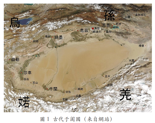 于阗(今和田)地處塔里木盆地南緣,塔克拉瑪干沙漠與崑 崙山脈之間,其命脈源於玉龍喀什河與喀拉喀什河的滋養。這獨特的地理位置使其成為絲綢之路南道上至關重要的綠洲樞紐,連接了東方的敦煌與西方的帕米爾高原,是古代商隊穿越浩瀚沙漠的必經之地見圖1)。于阗的經濟實力與其戰略地位緊密相連,主要建立在出產高價值、重量輕、適於長途運輸的商品為主。其中最著名的莫過於和田玉,其貿易歷史可追溯至商周時期,是古代中國玉石的重要來源。此外,傳說于闐公主將蠶種藏於髮髻中帶入王國後,當地遂之發展出繁榮的絲綢與地毯製造業。這種控制關鍵貿易路線並出產高價值商品的能力,為于闐王國的政治自主與文化自信奠定了堅實的經濟基礎,也使其具備了發行自身獨特貨幣的實力。