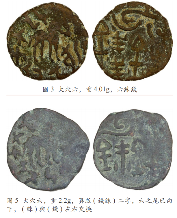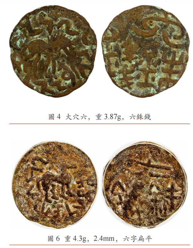 1. 小篆時期(西漢末):錢文“六”字曲線流暢、修長而彎曲 (~公元25年 )。