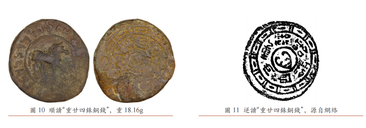 錢幣的另一面則鑄有漢字篆書。大錢的銘文為“ 重廿四銖銅錢 ”, 小錢則為“六銖錢”。這裡的“銖”是源自漢代中國的重量及貨幣 單位,自漢武帝發行五銖錢以來,成為中原貨幣體係的基石。于阗在其錢幣上明確標示出以“銖”為單位的幣值, 是向東方強權 (漢帝國) 的明確致意。這使得錢幣的價值在漢文化經濟圈內清晰可辨, 易於流通和兌換。 即便採用了西方的錢幣形制, 于闐依然在計量標準上承認了漢朝的權威性。