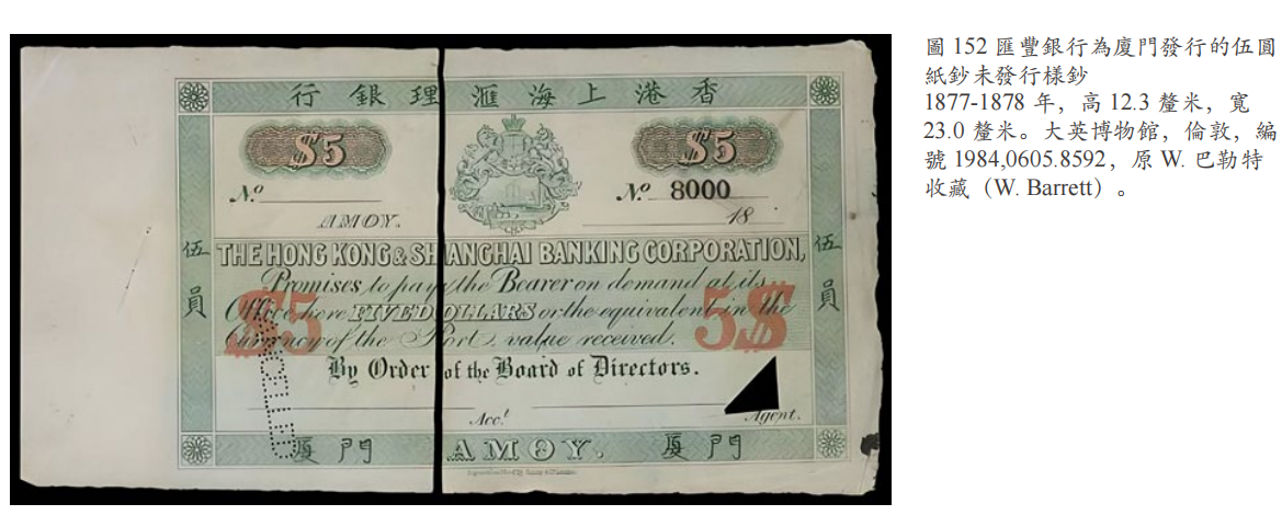 新鑄銀元雖大量發行,卻始終未能完全取代銀錠與外國流入銀元。除中南美洲各共和國銀元外,美國、日本、法國亦開始專為對華貿易鑄造貿易銀元。在清帝國諸多區域內,這些被稱為“貿易銀元”的外國貨幣與新興的中國銀元及早期流入的外國銀圓激烈競爭。隨着條約口岸開放,清政府被迫允許外國銀行發行紙幣流通。首家獲此特權的是匯豐銀行,該行自1866年起陸續通過上海、漢口、福州、廈門(圖152)、天津及煙臺等分行發行紙幣,並於1907年獲准在北京開設分行發行紙鈔。