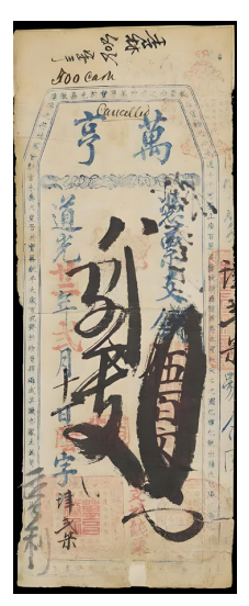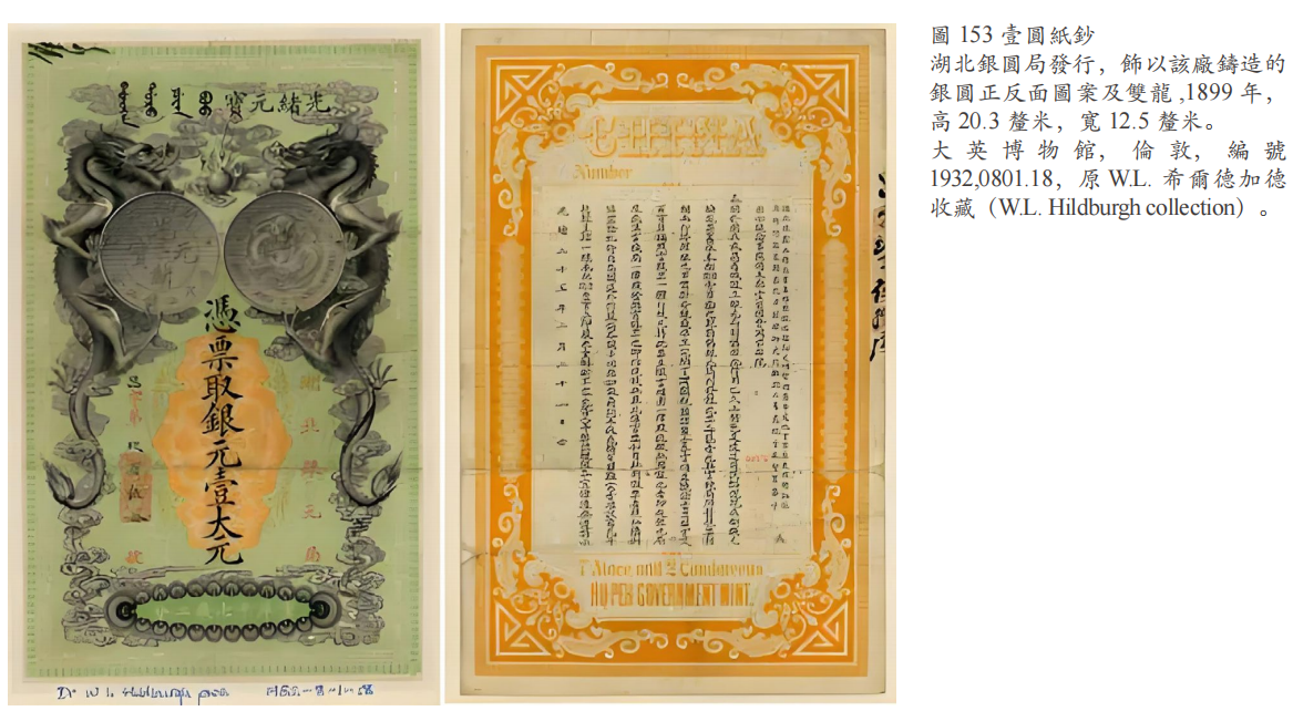 在中國發行外國紙幣也促使清廷及各省官府開始效仿西方技術印製發行官方紙幣(圖153)。1898年,中國通商銀行在北京、上海、廣州設立分行發行銀元券 ;1896年,清廷的鐵路局亦開始發行紙鈔 ;至1907年,清政府戶部更直接設立“大清戶部銀行”發行官票。