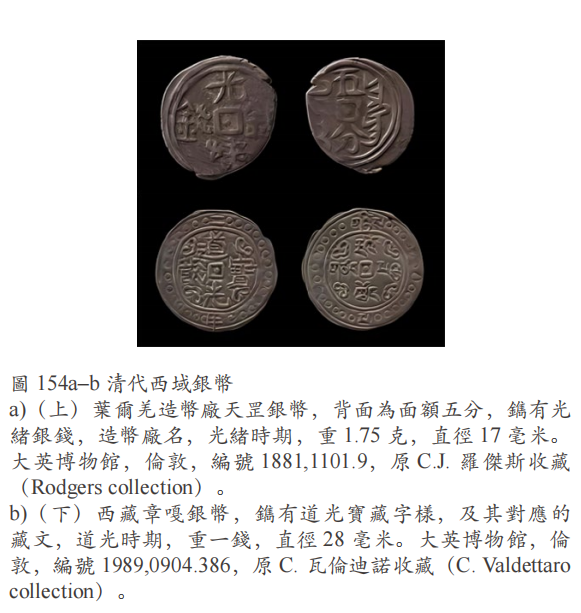 新疆與西藏兩地在重新被納入清朝版圖後,始終保持着具有地域特色的貨幣體係。自乾隆年間(1759年),新疆雖鑄造帶有中文年號的制錢,卻採用鉛銅合金而非黃銅材質,背面同時鐫有滿文與維文廠標。至光緒初年,新疆地區割據政權曾鑄造標重“五分”的維文銀幣(圖154a)。清廷收復新疆後,官方延續了這種小額銀幣的鑄造,但改為漢、維、滿三體文字並列。新疆與內地一樣,為應對太平天國運動引發的財政危機,也曾發行銅合金大錢。1889年機器造幣技術傳入後,當地鑄造的銀銅機製幣仍保持漢維雙語銘文,直至清帝國覆滅。