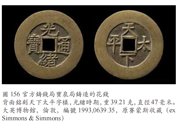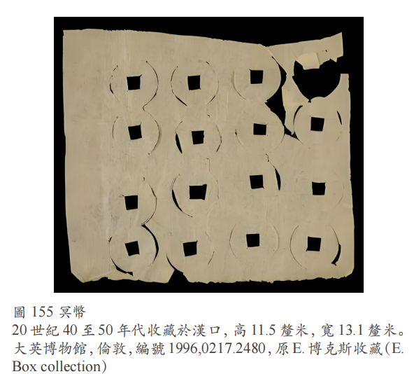 自秦朝(公元前221~207年)以來沿用兩千年的方孔錢,在中國文化中具有特殊地位。自漢代起,錢幣圖案就被廣泛用作財富的象徵。至清代,這種象徵仍在持續應用且盛行,例如將印有錢幣形狀的紙張作為冥幣,通過焚燒傳遞給逝者,供其在另一個世界使用(圖155)。後來冥幣逐漸演變為紙幣仿品和紙板制銀元的形式。