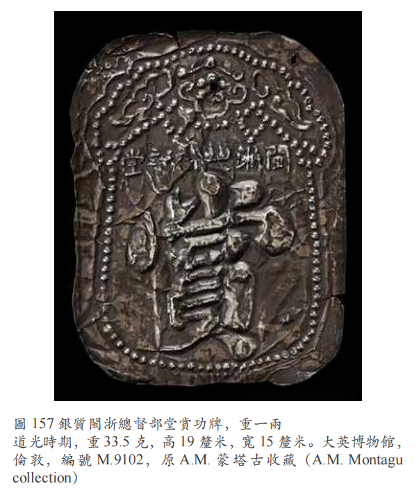 部分民間壓勝錢會摹刻官錢銘文以招祥瑞,如仿製全國各鑄局署名的“套子錢”就被用作旅人護身符。另有專為宗教儀式鑄造的仿製錢幣,用於驅邪或建築開光等場合。清廷有為褒獎軍功而賞銀的傳統,從而產生了專門的銀質獎章——“賞功牌”。這類獎章按特定銀兩標準鑄造,大英博物館藏有一枚1841年鴉片戰爭期間英軍從廈門繳獲的閩浙總督頒賞功牌(圖157)。太平天國戰爭時期,清廷及地方督撫開始仿照歐洲勳章形制頒發金銀軍功章,至1882