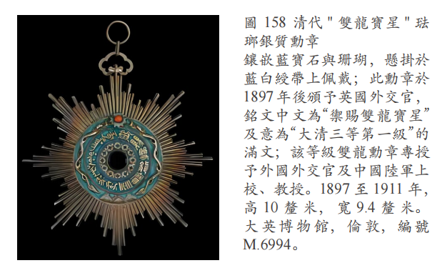 年,發展成一整套“雙龍寶星”文武勳章係列(圖158)。與此同時,採用歐洲造幣設備製作的紀念章也開始誕生。另外,歐洲傳教士還專門為中國基督徒定制過宗教紀念章。