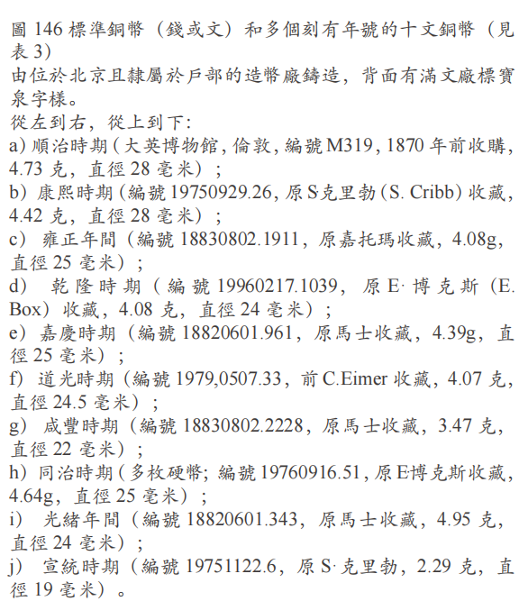 滿清政府開始控制中國後,延用明朝晚期的黃銅鑄幣體係鑄造新幣。通過五個階段的改革,全國設立了27個鑄幣廠,逐漸形成了嚴格的鑄幣品質和重量標準。每枚硬幣上都鑄有“順治通寶”字樣,表明這是清朝第一位皇帝順治時期(1644~1661)的流通貨幣。隨着滿清軍隊統一中國,硬幣被快速生產出來,最初是為了滿足軍事開支的需求。這些硬幣在中文中被稱為“錢”或“文”,在英文中稱為“cash”,在法文中稱為“sapèques”。它們通過用母錢砂模來大規模生產,母錢本身則是從手工雕刻的祖錢翻鑄而來,從而確保鑄造錢幣的統一性。自1657年起,銅錢背面鑄有滿文的鑄幣廠名,這種樣式一直延續到清朝結束(表3 ;圖146)。每個鑄幣廠都能生產數億枚硬幣,因此清朝當局能夠供應大量新幣,估計在1651~1657年間每年生產了超過20億枚硬幣,同時逐步淘汰明朝的舊幣。除了新幣外,因為從美洲進口的白銀數量持續增加,白銀繼續起着重要作用。清朝當局試圖使銅幣價值與白銀價值相關聯,設定的名義比率為1000枚幣可兌換一盎司 / 兩白銀,但在實際交易中很少遵守這一標準。同時仍有人支持使用紙幣。1651年發行了約128,000張面值為1000文的紙幣,但在1662年廢除使用。清朝初期建立的鑄幣體係一直延續到19世紀。硬幣上鑄有新銘文,標明每位皇帝的年號及其作為貨幣的功能(表3)。多個鑄幣廠繼續生產硬幣,產量通常很高,乾隆、嘉慶和道光時期平均每年生產約20億枚硬幣。儘管這一產量看似驚人,但與人口規模相比,其規模相對較小,每年人均生產不到十枚硬幣。這表明貨幣經濟有限,許多社會底層和農村地區的交易以實物或信用形式進行。然而,黃銅鑄幣的穩定廣泛供應使硬幣在許多場合中受到歡迎。這一生產規模需要大量的銅,主要來自中國雲南和日本的礦山。與白銀進口類似,大部分銅通過荷蘭船隻從日本運到中國。